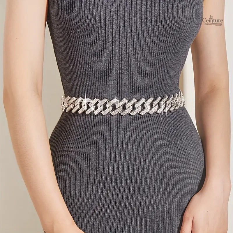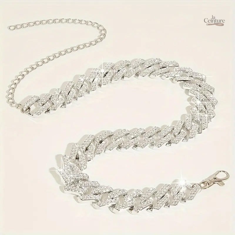 Conçue pour sublimer vos robes et combis, cette ceinture se distingue par sa chaîne délicate et ses strass scintillants. Disponible en or et argent, elle apporte une luminosité parfaite à vos tenues, rendant chaque instant spécial.
