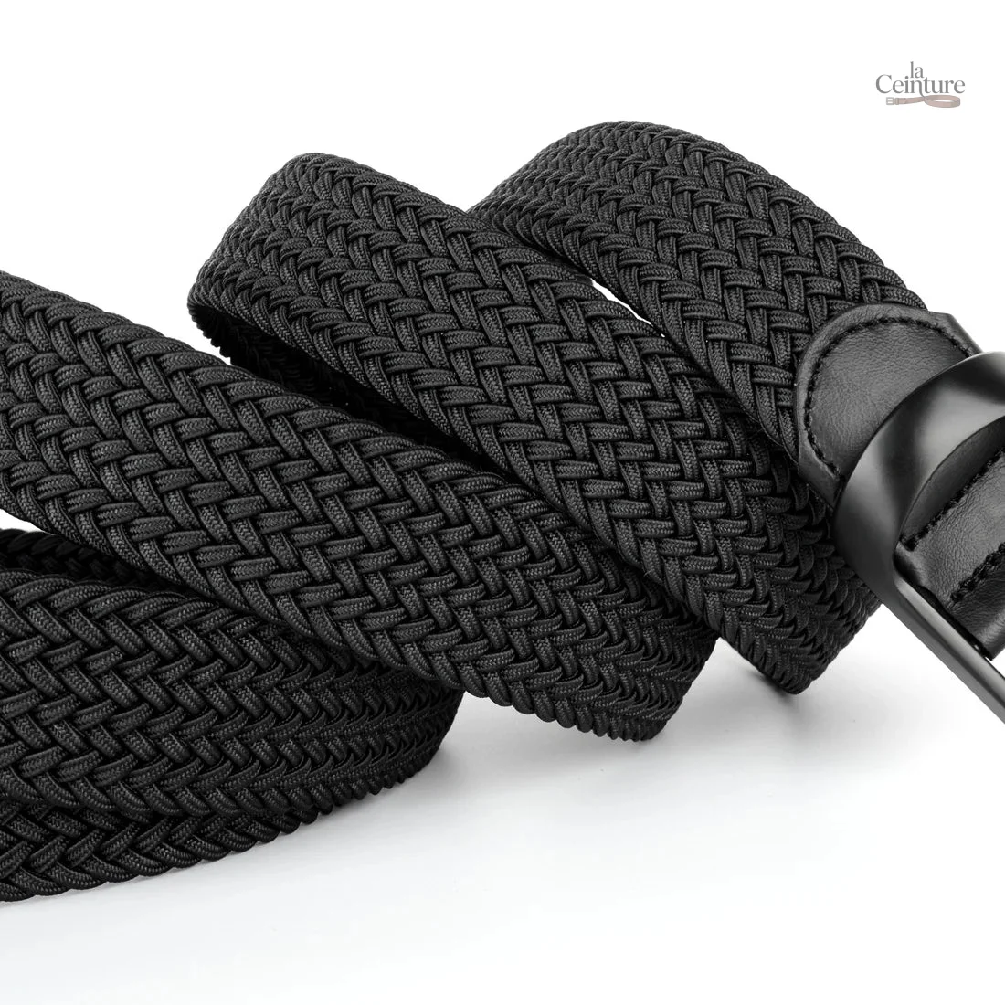 Ceinture tressée élastique pour homme, alliant style et confort. Disponible en plusieurs tailles (XS à 2XL), parfaite pour les chinos, pantalons et shorts. Boucle classique noire.